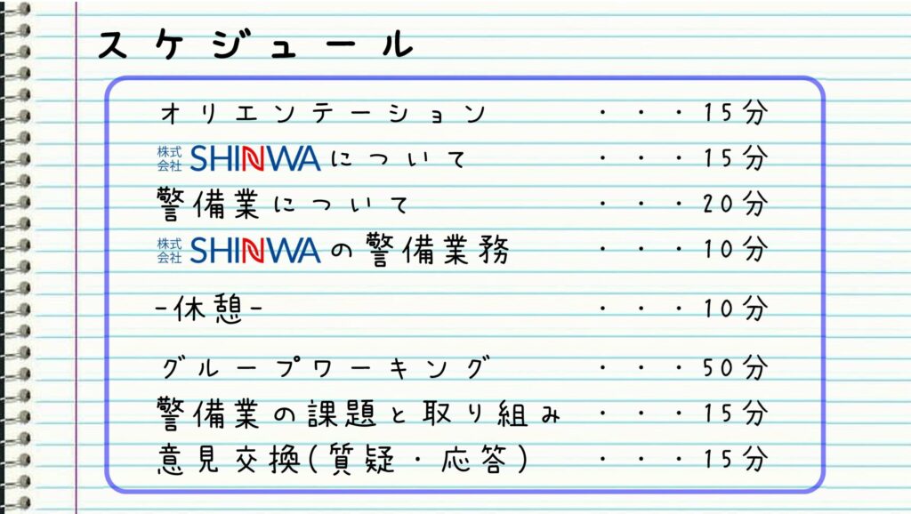 会社のことや警備業のこと、警備業がどのように地域貢献をしているのかを学習してもらい、また警備業の抱える課題やそれに対してどんな取り組みをしているのかを紹介しました。