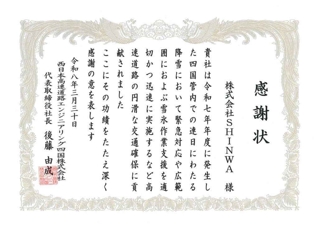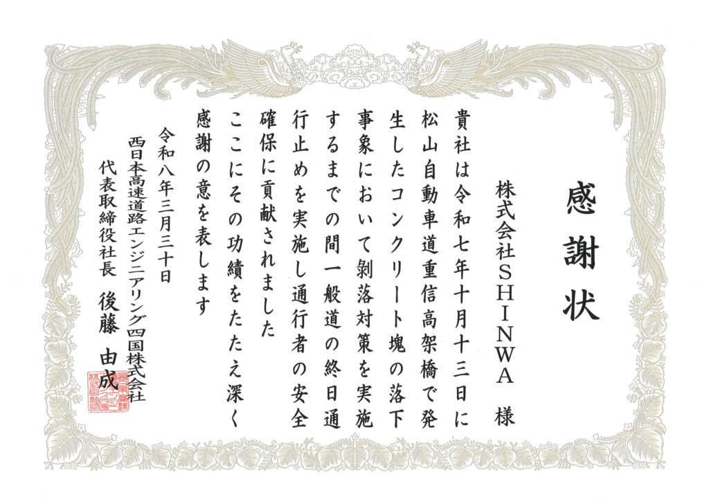 この度、西日本高速道路エンジニアリング四国株式会社様より、2025年度の高速道路における交通保安業務への貢献に対し、感謝状をいただきました。