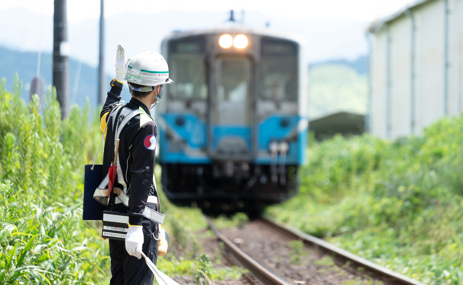 列車の到着前に、ショベルカーやクレーン車に停止指示を出します。