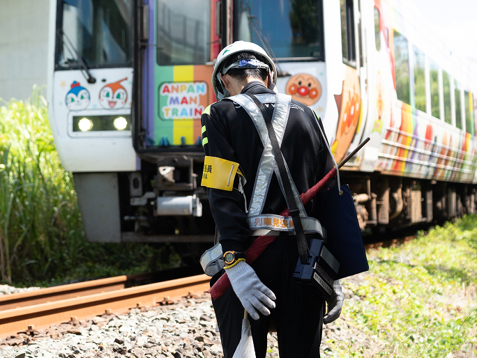 工事現場付近の線路際にて、列車の往来を見張ります。列車の往来をいち早く確認します。