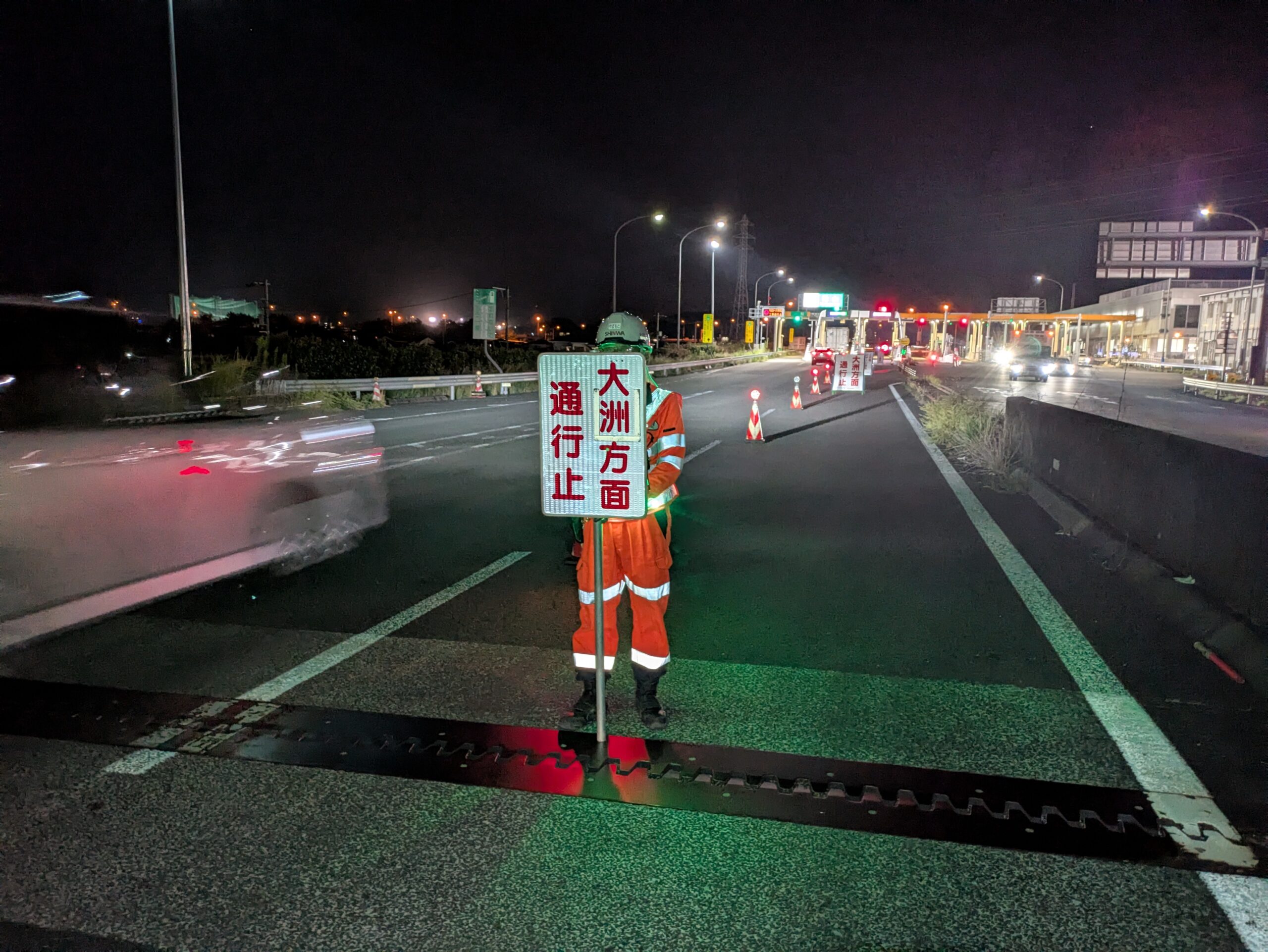 松山自動車道、今治小松自動車道において、高速道路の補修、点検のため通行止め規制と交通誘導警備を実施しました。